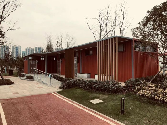 拼裝廁所;在廠里做好各個廁所部件,再到現(xiàn)場組裝在一齊,適合不易運輸?shù)拇笮蛶?。這座箱式廁所,女廁5個蹲位內(nèi)配工具間,男廁2個蹲位+2小便斗,第三衛(wèi)生間由殘疾馬桶、助力洗手盆和兒童馬桶、兒童洗手盆外加嬰兒臺等設(shè)施。廁所前后有窗,通風(fēng)采光,前部走廊裝有屋檐,防雨防曬。此廁所位于公路綠道邊,整體大氣,功能齊全,造型美觀,是一道難得的靚麗景觀!